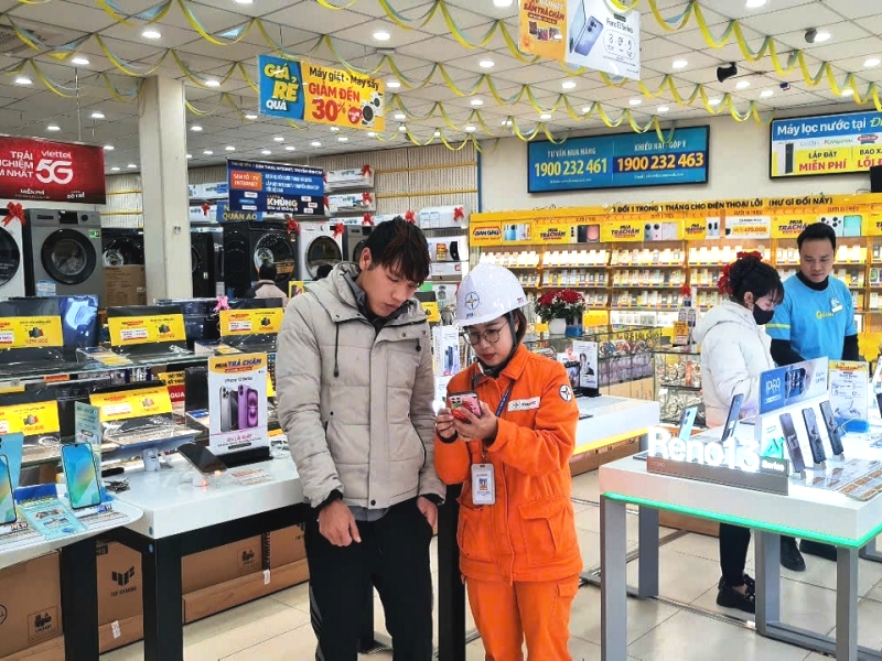 Nhân viên Đội Quản lý Điện lực khu vực hướng dẫn khách hàng theo dõi sản lượng điện tiêu thụ trên app Chăm sóc khách hàng