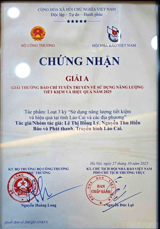 Giải báo chí tuyên truyền về sử dụng năng lượng tiết kiệm và hiệu quả năm 2025 khép lại với dấu ấn thành công toàn diện, khẳng định tầm quan trọng của báo chí trong việc thúc đẩy chuyển đổi năng lượng và lan tỏa thói quen tiêu dùng bền vững. Việc Công ty Điện lực Lào Cai cùng Báo Lào Cai nhận giải A không chỉ là niềm tự hào của ngành Đện địa phương, mà còn là động lực để đơn vị tiếp tục đổi mới, sáng tạo trong công tác tuyên truyền, góp phần thực hiện mục tiêu sử dụng năng lượng xanh – sạch – an toàn – tiết kiệm vì tương lai phát triển bền vững.