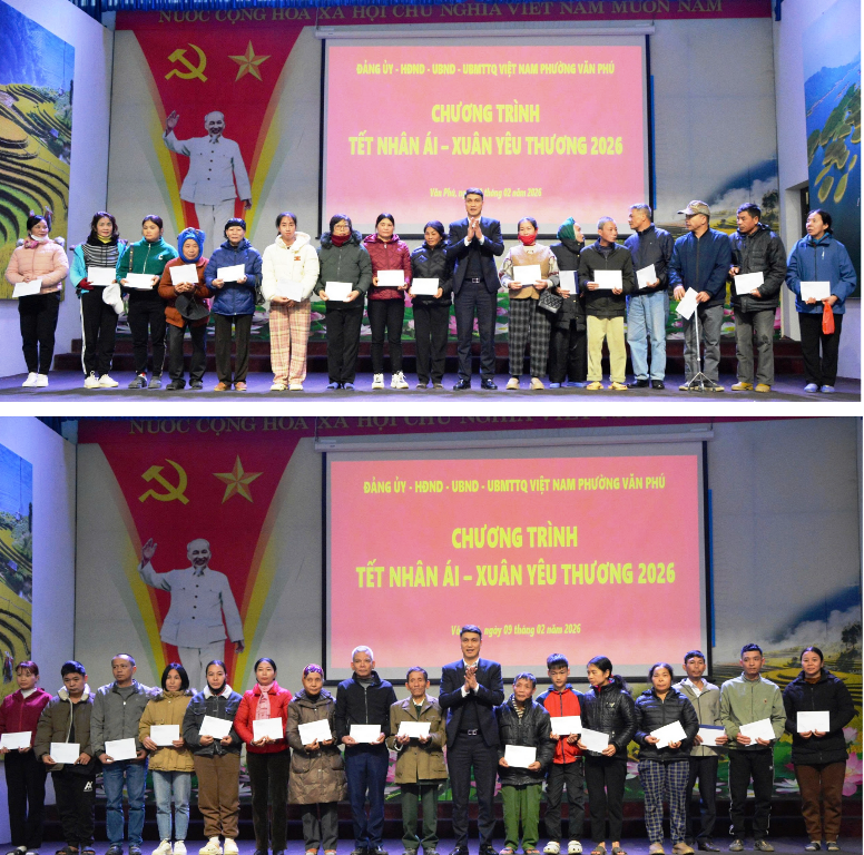 Theo Ban Tổ chức, chương trình “Tết nhân ái – Xuân yêu thương 2026” năm nay có sự tham gia của 22 cơ quan, đơn vị, tổ chức và nhà tài trợ, trao tặng 520 suất quà bằng tiền và hiện vật, với tổng trị giá gần 200 triệu đồng cho các hộ nghèo, hộ cận nghèo và hộ có hoàn cảnh đặc biệt khó khăn trên địa bàn phường Văn Phú.