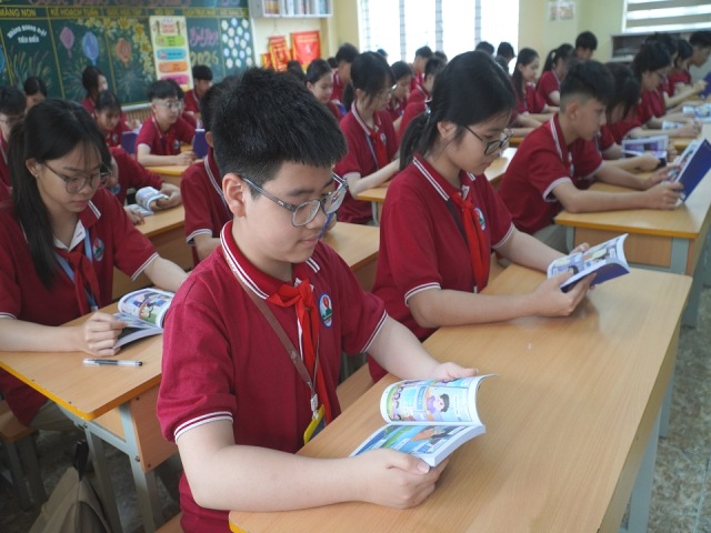 Các em học sinh yêu thích khám phá và học hỏi về tiết kiệm điện qua cuốn sách tranh Bí mật Quả cầu Tím