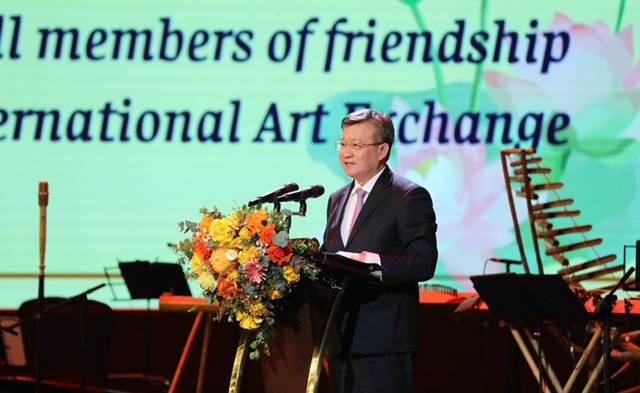 Chủ tịch Liên hiệp các tổ chức hữu nghị thành phố Hà Nội Nguyễn Ngọc Kỳ phát biểu khai mạc Chương trình giao lưu nghệ thuật quốc tế "Chào năm mới 2026"