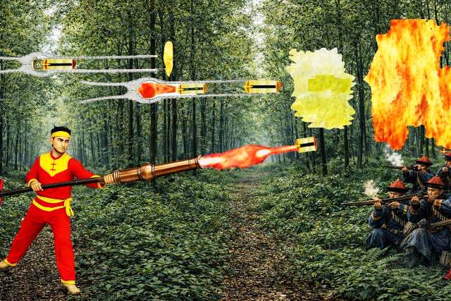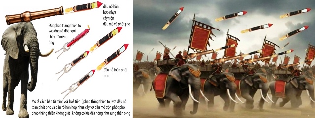Chiến binh Đại Việt dùng ống hỏa hổ bắn khối hỗn hợp nhựa thông trộn dầu mỏ, phốt pho vào địch, khối này đập vào giặc vỡ tung, tung hỗn hợp trên vào không khí rồi nhờ phốt pho lập tức tự cháy nhấn chìm giặc trong biển lửa