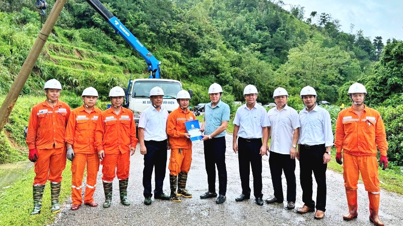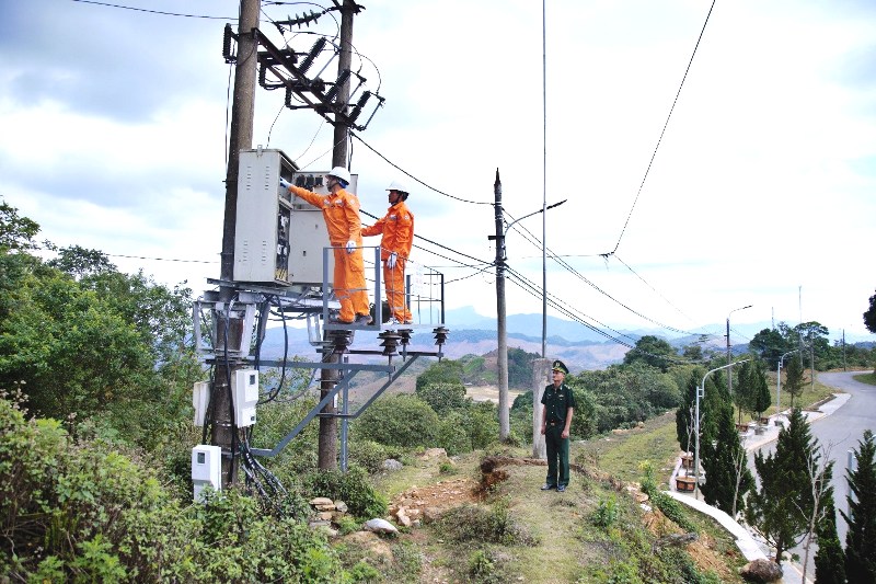 Cán bộ, công nhân viên EVNNPC phối hợp với lực lượng Bộ đội Biên phòng kiểm tra lưới điện, đảm bảo cung cấp điện an toàn, liên tục tại các địa bàn miền núi, biên giới