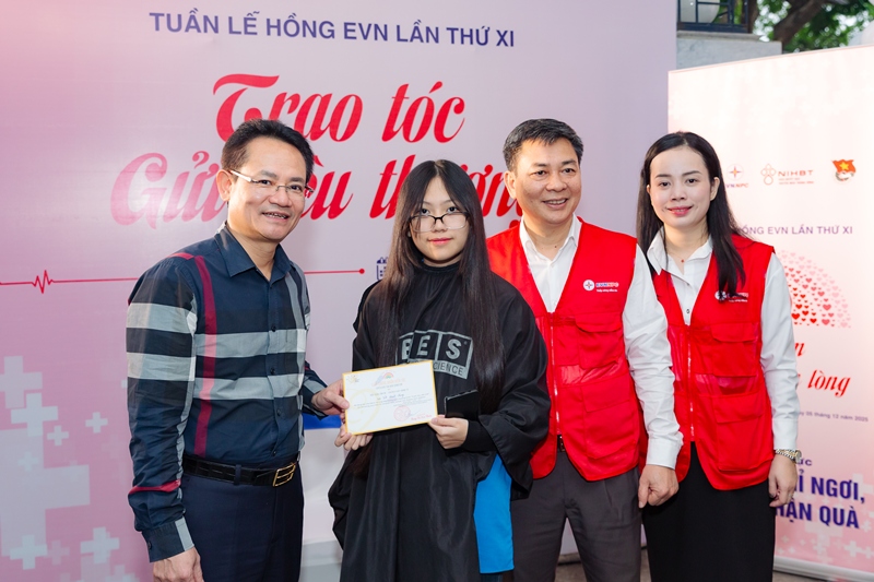 Lãnh đạo EVNNPC trao giấy chứng nhận hiến tóc cho con em CBCNV