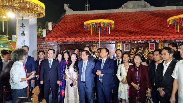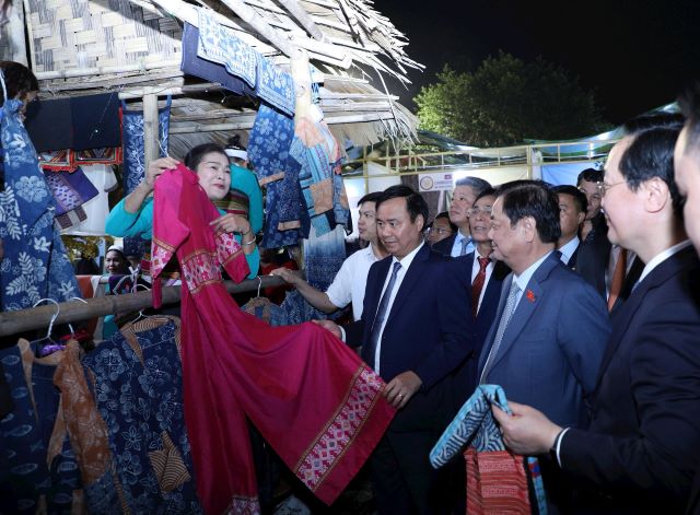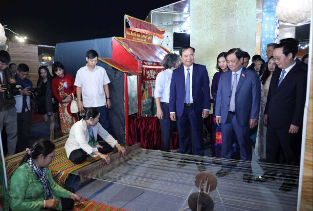 Đại biểu thành phố Hà Nội dự khai mạc có: Phó Bí thư Thành ủy, Chủ tịch UBND thành phố Nguyễn Đức Trung; Ủy viên Ban Thường vụ Thành ủy, Phó Chủ tịch UBND thành phố Nguyễn Mạnh Quyền cùng đại diện lãnh đạo các tỉnh, thành phố trong cả nước. (Ảnh các đại biểu tham quan không gian trình diễn sản phẩm làng nghề)