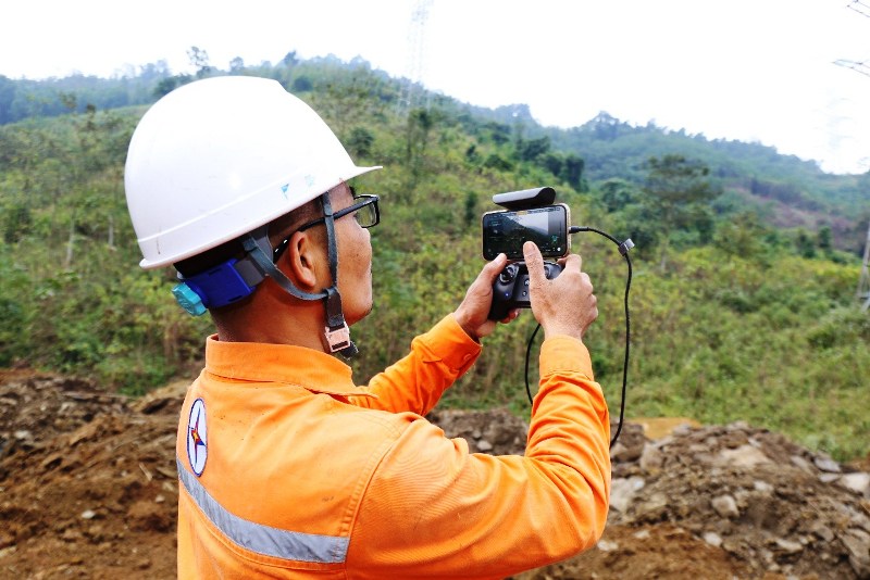 Anh Nguyễn Xuân Đồng, công nhân Đội Quản lý vận hành đường dây 110 kV Lào Cai, sử dụng thiết bị flycam để kiểm tra tình trạng đường dây