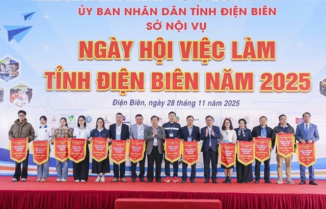 Các đồng chí lãnh đạo tỉnh Điện Biên, lãnh đạo Sở Nội vụ tỉnh Điện Biên trao Cờ lưu niệm tặng các đơn vị tham gia Ngày hội Việc làm năm 2025 tại tỉnh Điện Biên