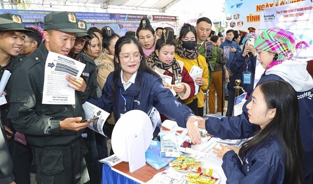 Có rất đông người lao động là sinh viên, chiến sĩ các lực lượng vũ trang tham gia tìm hiểu việc làm tại Ngày hội Việc làm do tỉnh Điện Biên tổ chức.