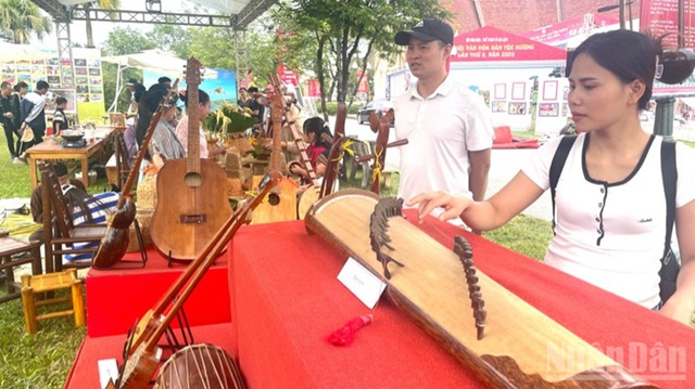 Khách tham quan tìm hiểu bộ nhạc cụ làm từ cây dừa