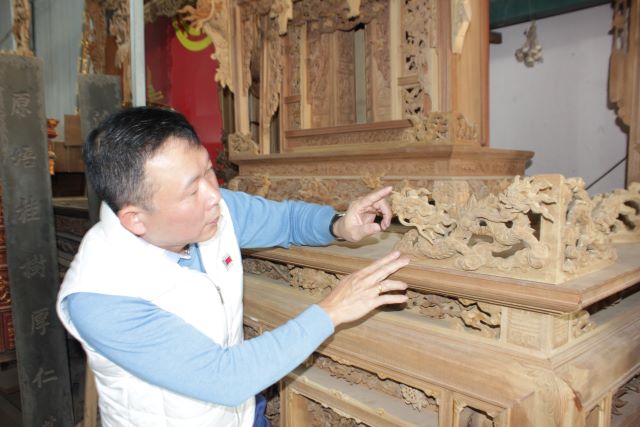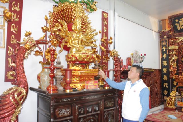 Nghệ nhân Nguyễn Viết Dũng - Phó Chủ tịch Hội nghệ nhân thợ giỏi Sơn Đồng giới thiệu về tác phẩm Tượng Phật nghìn mắt nghìn tay