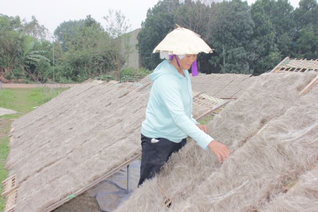 Giàn miến đặt nghiêng, mặt trên đón nắng, mặt dưới đón gió. Một ngày người phơi phải đảo miến từ một đến hai lần để dảm bảo sợi miến khô đều. Ảnh khu phơi miến của cơ sở sản xuất Miến dong Đức Phát
