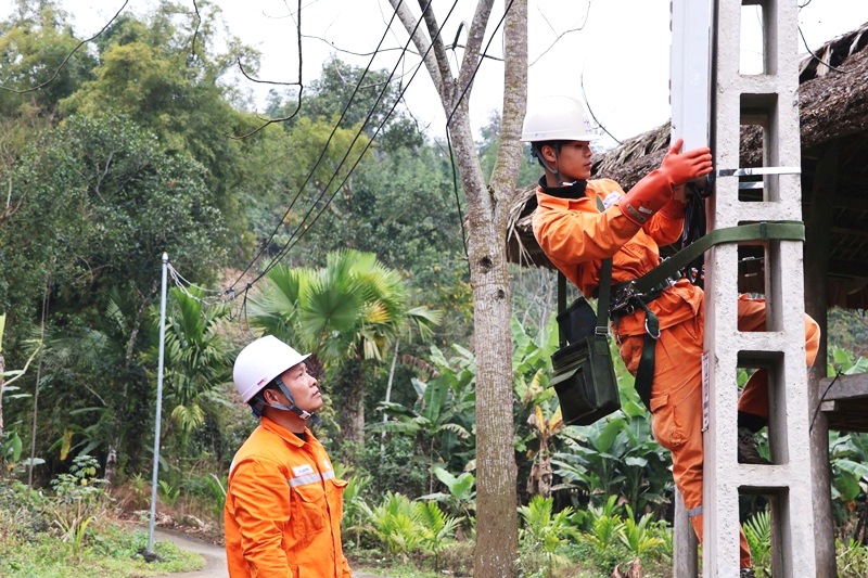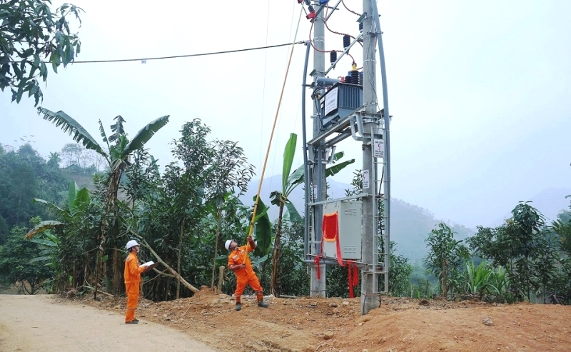 Nhân viên Đội Quản lý Điện lực khu vực Lục Yên kiểm tra hệ thống lưới điện trên địa bàn thôn Thâm Pất