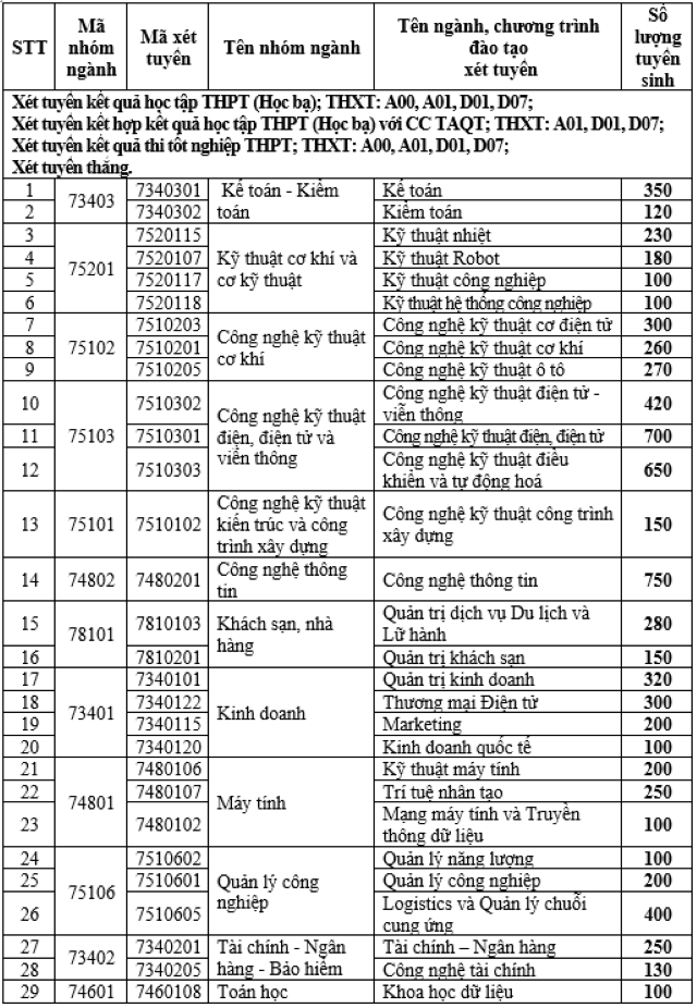 Năm 2026, các chương trình đào tạo của Trường Đại học Điện lực dự kiến tuyển sinh với số lượng chỉ tiêu, phương thức xét tuyển và tổ hợp cụ thể như sau: