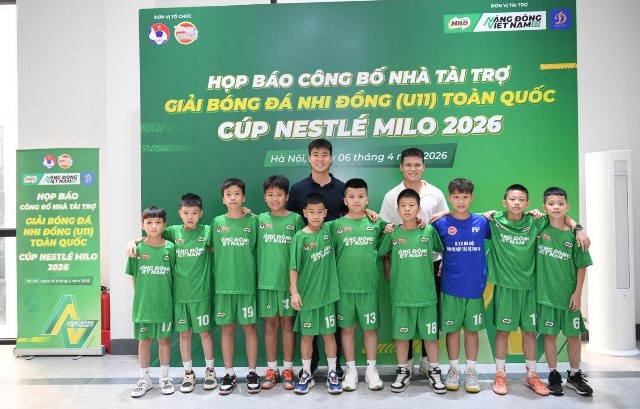 Hai tuyển thủ Đội tuyển bóng đá Quốc gia Việt Nam Đỗ Duy Mạnh và Phạm Tuấn Hải cùng các cầu thủ nhí tại Lễ công bố Giải Bóng đá Nhi đồng (U11) Toàn quốc Cúp Nestlé MILO 2026