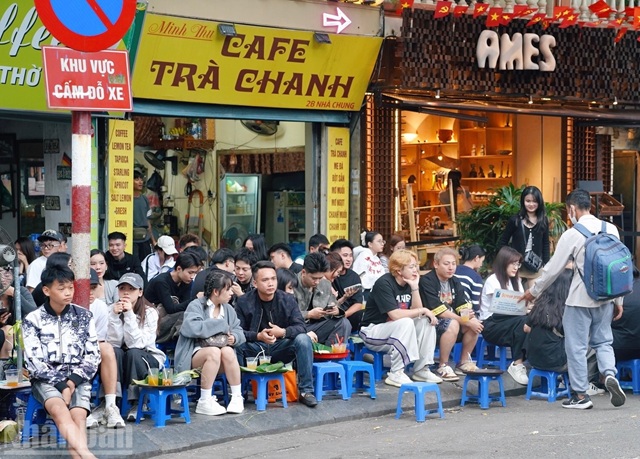 Nhiều nhóm bạn trẻ khoác áo dạ, quàng khăn ngồi trò chuyện, hít hà cốc trà nóng, ly cà-phê sữa chua trong tiết trời lành lạnh. Không khí mùa đông đến sớm khiến góc phố quen bỗng trở nên ấm áp và rộn ràng hơn.