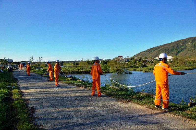 Nhưng trong cái mênh mông hoang tàn và ảm đạm ấy, có những tia sáng màu cam bắt đầu nhen nhóm, không chịu khuất phục. Họ là người lính của ánh sáng, những công nhân của Công ty Điện lực Hà Tĩnh, cùng hơn 1.000 cán bộ xung kích đến từ các đơn vị bạn trực thuộc Tổng công ty Điện lực miền Bắc (EVNNPC) mang trong mình sứ mệnh “Thắp sáng niềm tin”. Tôi tìm thấy họ giữa một trận địa nóng bỏng và cam go bậc nhất, đó là điểm vượt sông Rác, thuộc địa phận xã Cẩm Trung. Nơi đây, trận chiến thực sự đang diễn ra, tuy không có khói lửa của bom đạn, nhưng mức độ quyết liệt và sự hy sinh thì không hề kém cạnh. Mục tiêu của họ là thay thế bằng được sợi cáp 35kV bị bão Bualoi xé đứt, để giành lại nguồn sáng cho hơn 6.000 hộ dân của hai xã Cẩm Trung và Cẩm Lạc. Tôi đứng trên bờ sông, cơn gió sau bão vẫn còn lồng lộng, mang theo cái mùi tanh nồng của đất, của nước. Dưới chân cột điện trung thế mới được dựng lên, bùn đất nhão nhoét, quấn chặt lấy từng đôi ủng, níu kéo từng bước chân. Mặt sông Rác thường ngày hiền hòa, giờ đây vẫn còn ngầu đục, cuộn chảy dòng nước giận dữ. Khoảng sông rộng bốn trăm mét tưởng chừng ngắn ngủi trong điều kiện bình thường nhưng giờ đây lại là một thử thách khổng lồ, trở thành vực sâu ngăn cách giữa bóng tối và ánh sáng.