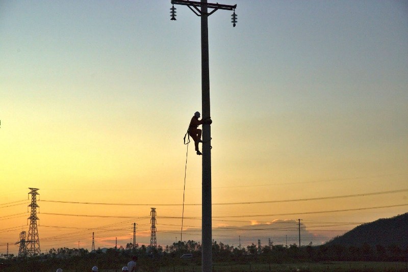 Khi mặt trời lặn xuống, công việc của họ vẫn chưa dừng lại. Bóng lưng người thợ điện đổ dài trên nền trời hoàng hôn đã tạc nên bức phù điêu sống động và kiêu hãnh về người lao động thầm lặng "vá trời đêm"