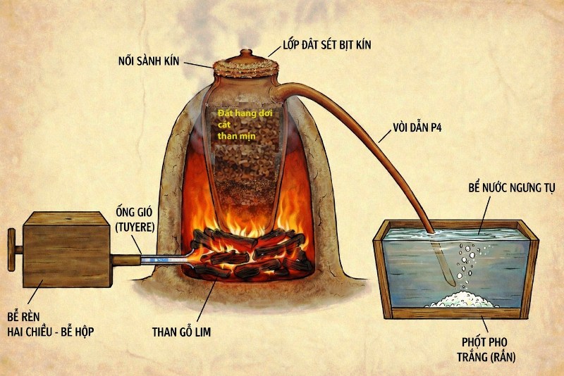 Bí mật siêu vũ khí Đại Việt, lò nung phốt pho từ đất hang dơi, cát , than mịn (mô phỏng hiện tượng đốt gỗ lim trong hang dơi – hơi Phốt pho ngưng tụ khi gặp nước). Bí kíp để có Phốt pho là phải nung 2 lần với hai nhiệt độ khác nhau
