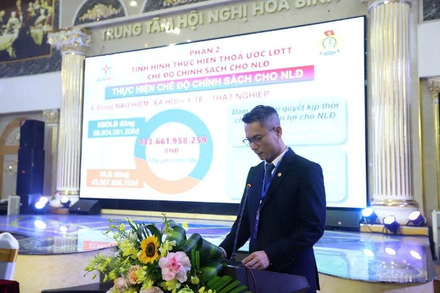 Ông Trần Mạnh Duy - Phó chủ tịch Công doàn PTC1 báo cáo kết quả Hội nghị Người lao động các cấp và tình hình thực hiện TƯLĐTT, chế độ chính sách cho NLĐ năm 2025