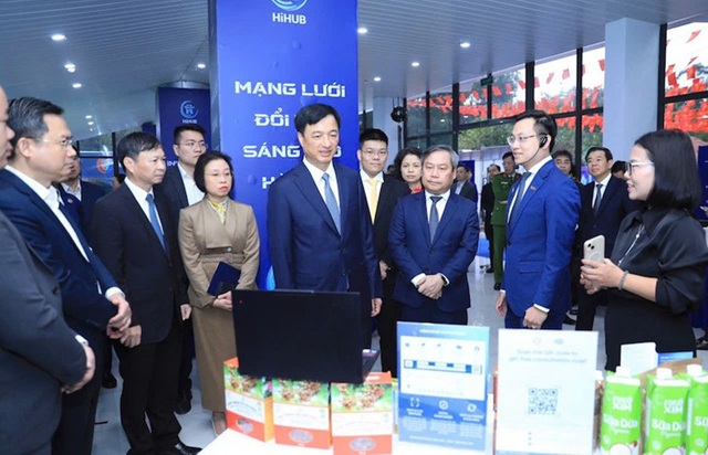 Đồng chí Bí thư Thành ủy Hà Nội Nguyễn Duy Ngọc, đồng chí Chủ tịch Ủy ban nhân dân Thành phố Hà Nội Vũ Đại Thắng cùng các đồng chí lãnh đạo thành phố Hà Nội tham quan gian trưng bày sản phẩm tại triển lãm Mạng lưới đổi mới sáng tạo Hà Nội. (Ảnh: Viết Thành)