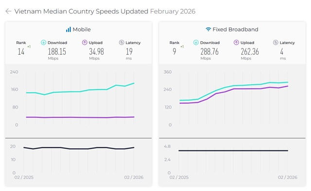 Tốc độ trung bình mạng Internet di động và cố định của Việt Nam, tháng 2/2026. Nguồn: Ookla