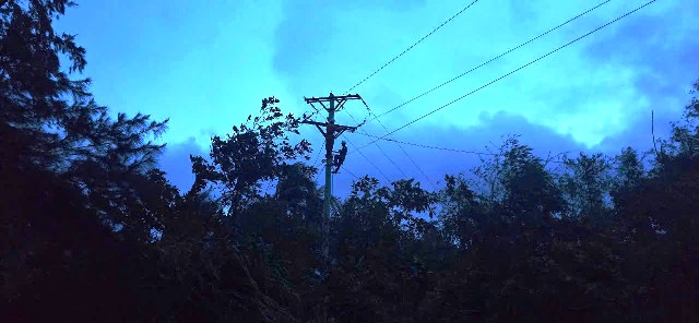 Từ sáng sớm, đến tối mịt, họ vẫn miệt mài, mong người dân sớm có điện ổn định sinh hoạt. Trong ánh chiều muộn dần chuyển sang đêm, bóng dáng người thợ điện vẫn lặng lẽ trên đỉnh cột như minh chứng cho tinh thần tận hiến không giờ giấc của những chiến sĩ áo cam.