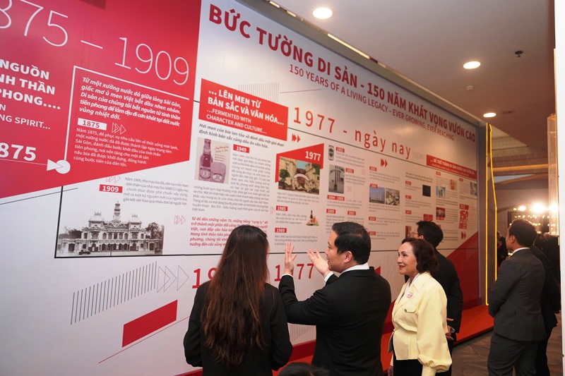 Các khách mời tham quan Bức tường di sản trưng bày các cột mốc hình thành và phát triển của SABECO