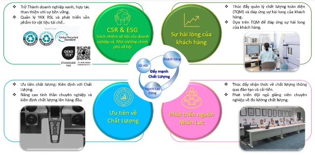 Từ bối cảnh thị trường quốc tế (dịch chuyển chuỗi cung ứng, yêu cầu bền vững tăng cao) và kết quả mở rộng gần đây, có thể thấy YKK đặt trọng tâm vào ba hướng chính tại Việt Nam: (1) nâng cao công suất sản xuất để phục vụ khách hàng toàn cầu; (2) đầu tư sản xuất “xanh” và tự động hoá để giảm chi phí và tăng sức cạnh tranh; (3) đa dạng hoá danh mục sản phẩm (ví dụ kết hợp khóa kéo với snaps & buttons) để cung cấp giải pháp trọn gói cho khách hàng may mặc. Những chiến lược này phù hợp với xu hướng các thương hiệu thời trang yêu cầu sự minh bạch chuỗi cung ứng và tiêu chí ESG ngày càng cao.